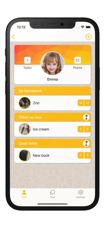 Create a profile for your child in a few seconds, which is accessible to all invited family members, with different access options, and start with a task. You have numerous options to select a task to be solved and rewards from a pool of templates or to upload them individually. If sub-goals are achieved in the completion of the task, you can award points with a selected animated symbol or avatar until the target points previously set with your child are achieved. If your child manages the task, an animated trophy is presented and the agreed reward can be redeemed.